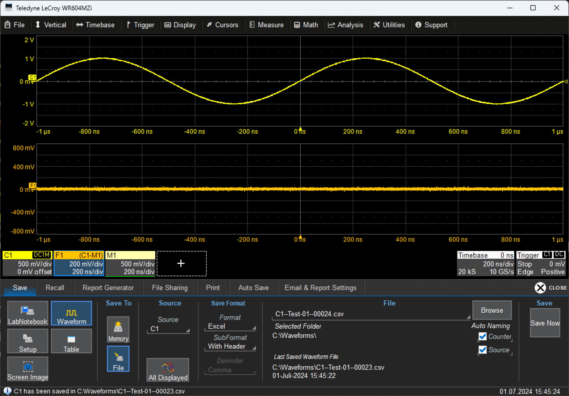 Das folgende Bild zeigt, dass die importierte LeCroy Binärkurve keine Differenz hat zum Original-Signal.