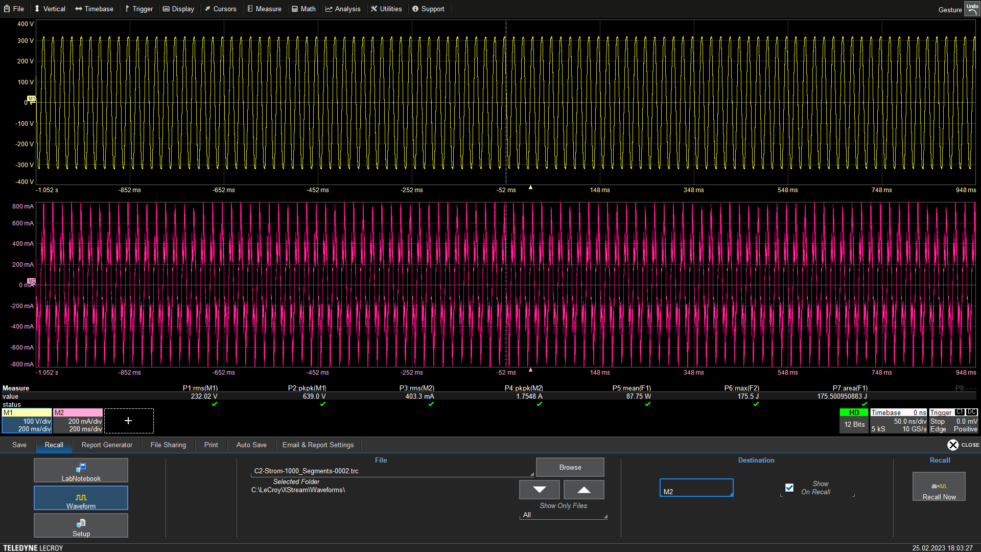 Die gespeicherten Kurven müssen nun in Memory-Kanäle geladen werden. C1-Spannung wird in M1 und C2-Strom wird in M2 geladen.
